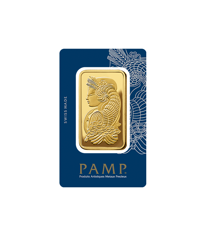 These 100% pure Gold PAMP Gold bars depict Fortuna, the Roman goddess of fortune. Worshiped under several forms, she appears on these 5 Tola Gold bars in the hallmark Pamp Suisse design featuring her cornucopia pouring out riches into her hands