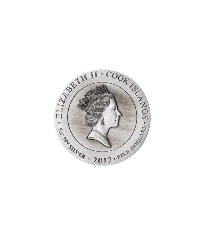 ountry: Cook IslandsYear: 2017Face Value: 5 DollarsMetal: SilverFineness (purity): 999/1000Weight (g): 155.5 (5 oz)Diameter (mm): 60.6Quality: Antique FinishMintage (pcs): 500Certificate (COA): YesPresentation case (box): Yes